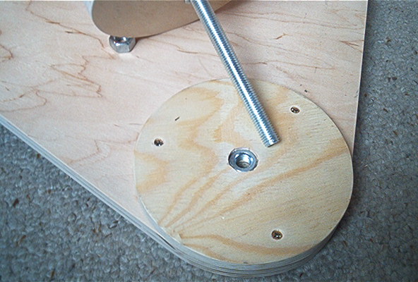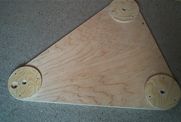 Następnym krokiem w budowie platformy jest wzmocnienie jej podstawy od spodu za pomocą kół wykonanych ze sklejki o średnicy 150mm (promień koła jest identyczny z promieniem zaokrąglenia podstawy platformy). Koła mocowane są do podstawy za pomocą 3 wkrętów do drewna o długości ok. 22-28mm rozmieszczonych co 120 stopni. Rozmieszczenie wkrętów nie jest krytyczne. Istotne jest aby w każdym z kół wykonać wcześniej otwór o średnicy 22mm na nakrętkę M12 w której obracać się będzie regulowana stopa podstawy. Centrycznie z otworem w kole wzmacniającym nalezy wykonać w podstawie otwór na śrubę stopy regulacyjnej o średnicy 12mm. Dodatkowo w kole wzmacniającym stronę południową należy wykonać otwór na południowy wspornik łożyskujący. Na pokazanym zdjęciu otwór ten ma 30mm średnicy i znajduje się 30mm od brzegu płyty (45mm od środka otworu 12mm). Wewnątrz tego otworu widać przygotowany już w podstawie platformy otwór 12mm na wspornik łożyskujący. |