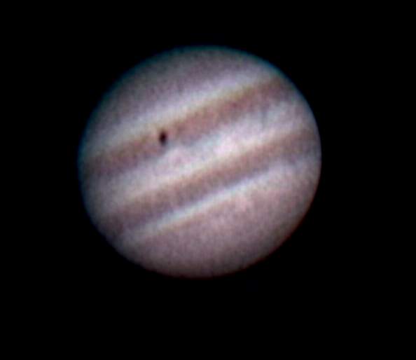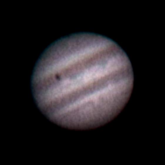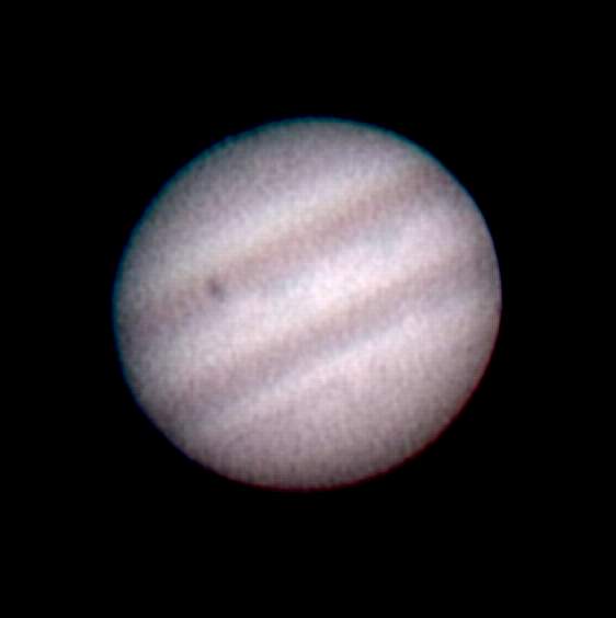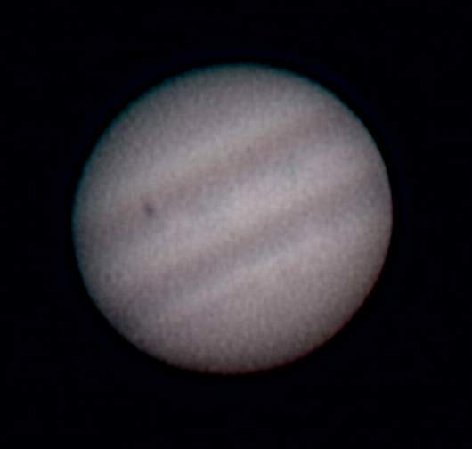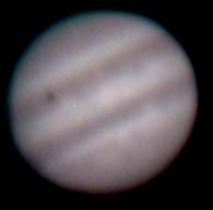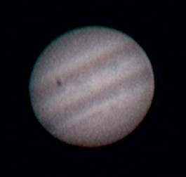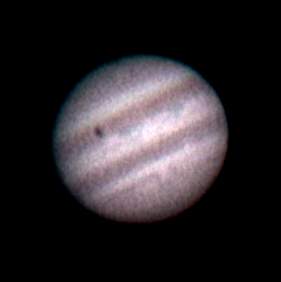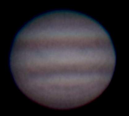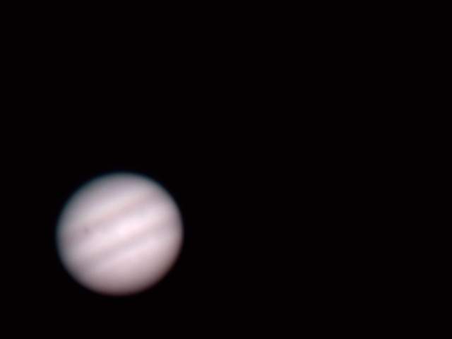 Kolejne zjęcia wykonałem w nocy z 28 na 29 maja. Warunki obserwacji były średnie, temperatura ponad 20 stopni, silne falowanie powietrza znad sąsiednich budynków i tradycyjnie zaświetlenie nieba przez reflektory oświetlające pobliski koścół.Zdjęcia wykonane za pomocą teleskopu Synta 200/1200 z soczewką barlowa x4 (wypadkowa ogniskowa 4.8m) na platformie paralaktycznej ze sterowaniem w obu osiach (sterowanie używane wyłącznie do korekty położenia teleskopu) oraz kamery Vesta przebudowanej na długie ekspozycje. Materiał złożony jest z ok. 40 klatek w każdym przypadku. Zdjęcia Jowisza zrobione są w mało korzystnym położeniu planety (ok. 25 stopni nad horyzontem). Wykonując zdjęcia planety uczyłem się też obróbki uzyskanego materiału w programie K3CCD. Pierwsze zdjęcie pokazuje Jowisza po pierwszych próbach opracowania materiału gdzieJowisz ma rozmiar naturalny wynikający wprost z naświetlania, drugie zdjęcie to Jowisz udoskonalony w procesie nauki obróbki pozyskanego materiału i powiększony 2 krotnie. Wyraźnie widoczny cień jednego z księżycy Jowisza na jego tarczy. Po drodze były kolejne zdjęcia : zdjęcie_2, zdjęcie_3, zdjęcie_4, zdjęcie_5, zdjęcie_6, zdjęcie nr 7. |
