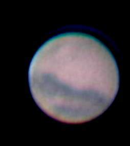 Mars wykonany 25-10-2005r. podczas sesji na platformie u Freberta z jego teleskopem Synta 200/1200 i moją modyfikowaną kamerą Vesta. Warunki obserwacji były przeciętne, Mars o godzinie 23 a więc dość nisko jeszcze a w dodatku filmowany przez gałęzie drzewa okolicznego ogródka. Zdjęcie wykonane z soczewką barlowa 4 razy co daje wypadkową ogniskową ok. 4.8m !. Zdjęcie złożone jest z ok. 50 klatek. Dość skąpa ilość materiału wynika z faktu, że większość czasu poświęciliśmy na wcelowanie teleskopem w obiekt. Niemodyfikowany teleskop Synta 200/1200 ma , co zrozumiałe, dość duże opory ruchu jak dla wymaganej dla fotografii precyzji i dlatego największym kłopotem było wcelowanie obiektu w środek pola widzenia kamery . Platforma ustawiona była dość szybko, bez dbałości o doklądność ale i tak obiekt przebywał w polu widzenia kamery od kilkudziesięciu sekund nawet do 2,3 minut a więc wystrczająco długo do nakręcenia większej ilości materiału. Ograbniczała nas mała ilość miejsca na dysku, brudny barlowe (na części zdjęć widać czarne plamy z soczewki) a także prawdopodobnie niedoskonałe wyostrzenie obrazu. Zdjęcie jest obrabiane w programie K3CCD i dwukrotnie powiększone. Korekta polegała na użyciu histogramu oraz unsharp mask. |