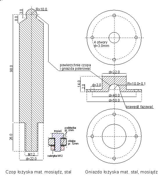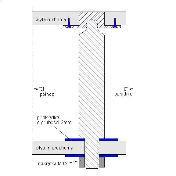 Łożysko południowe jest jednopunktowe i składa się ze wspornika przegubu kulowego oraz gniazda tego przegubu. Wspornik przegubu mocowany jest do płyty dolnej z wykorzystaniem 2 podkładek metalowych o grubości 2mm oraz nakrętki M12. Grubość podkładki jest o tyle ważna, że łącznie z długością wspornika (trzpienia) aż do środka przegubu kulowego tworzy odcinek równy dokładnie 100mm. |