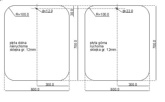 Platforma zrobiona będzie z dwóch płyt wykonanych ze sklejki 12mm. Prawdopodobnie na końcu prac obie płyty wzmocnione zostaną wzdłuż dłuższego boku podłużnymi wzmocnieniami z profili drewnianyach dla dodatkowego usztywnienia konstrukcji. Na razie rysunek płyt pokazuje główne wymiary oraz miejsce na mocowanie łożyska południowego w dolej i górnej płycie. Wkrótce naniesione zostaną linie mocowania wsporników łożyskowania północnego. Może się okazać, że w płycie dolnej konieczne będzie wykonanie wycięcia na mechanizm napędowy.