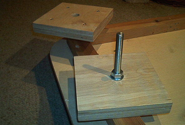 | Stopa platformy wykonana jest z dwóch kawałków sklejki o wymiarach 150/150/12mm skręconych razem czterema wkrętami do drewna o długości ok. 40mm. W jednym z kawałków należy wywiercić otwór o średnicy 20mm a w drugim o średnicy 12mm. W wykonane otwory należy wstawić śrubę M12 o długości 100mm w taki sposób aby łeb śruby po dokręceniu jej nakrętką schował się całkowicie w dolnej części (tej z otworem 20mm). | ![]() |