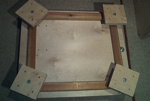 Podstawa platformy została wzmocniona usztywniającymi belkami poprzecznymi o wymiarach 30/50mm. W narożnikach wzmocnień widać nakrętki M12 służące do mocowania stóp regulujących wysokośc i poziom platformy. Wzmocnienia przykręcone są od spodu podstawy za pomocą kilku wkrętów do drewna o długości ok. 20mm.
