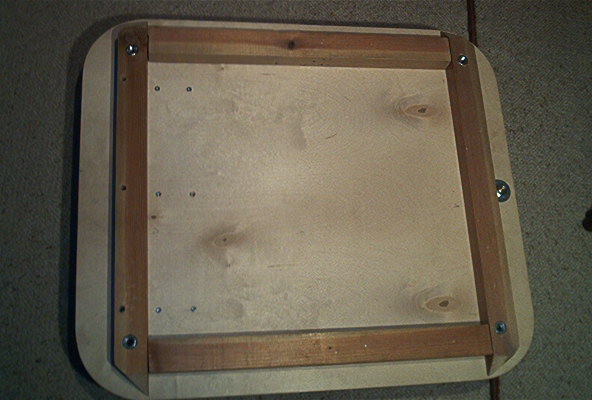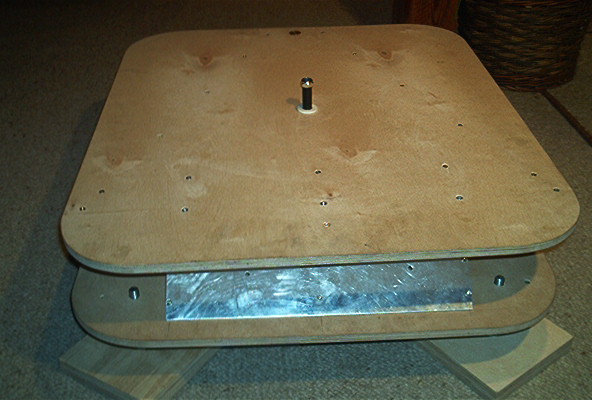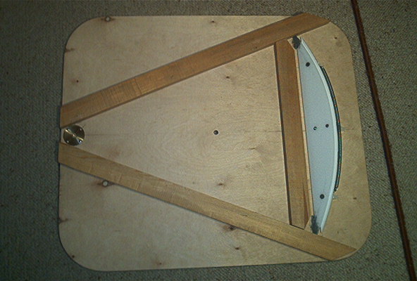 Górna, ruchoma część platformy została wzmocniona od spodu belkami o rozmiarach 15/40mm. Belki wzmacniające umieszczone są na planie trójkąta bo płyta górna podparta jest w 3 punktach. Wzmocnienia przykręcone są od spodu płyty ruchomej za pomocą kilku wkrętów do drewna o długości ok. 20mm. |