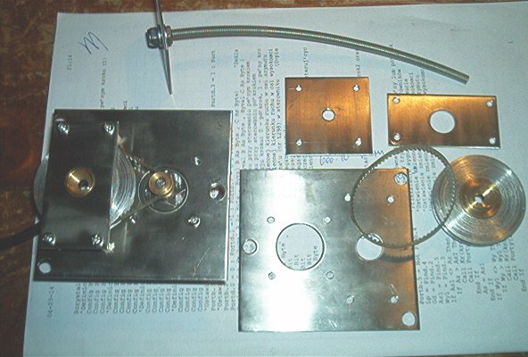 Zespół napędowy składa się ze wsporników wykonanych z blachy nierdzewnej, kompletu kół zębatych (12 oraz 60 zebów) z paskiem zębatym 177.5mm oraz śruby łukowatej M6 o promieniu gięcia 300mm ze wspornikiem. Na zdjęciu pokazana zostala przekladnia w komplecie z silnikiem krokowym - może to być np. jeden z pokazanych silnikow 1, 2, 3 lub 5 o rozstawie śrub mocujących 31mm (silnik nie wchodzi w skład zestawu). W komplecie znajdują się także gumowe podkładki i wkręty mocujące. Dokumentacja do wykonania koziołka