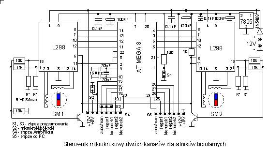 Sterownik silników krokowych bipolarnych ze sterowaniem mikrokrokowym z podzialem kroku na 10 - jest to częściowa realizacja układu pełnego sterowania ograniczona do układu sterowania mikrokrokowego ze wzmacniaczami mocy w dwóch kanałach |