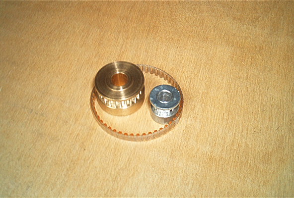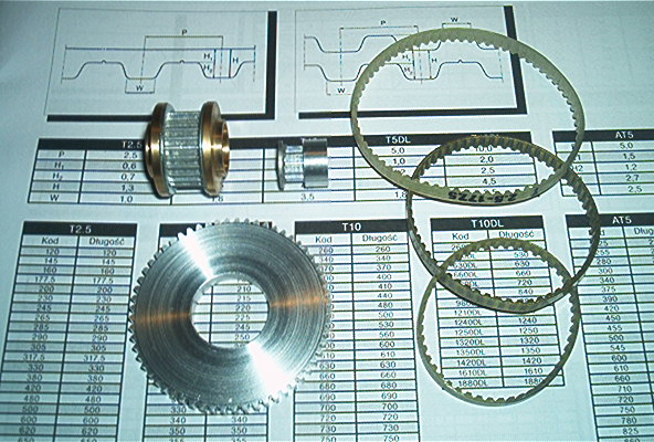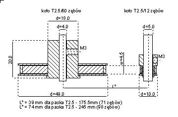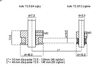 Przekładnia składa się z dwóch koł zębatych oraz paska synchronicznego systemu T2.5. Na zdjęciu pokazane zostały elementy przekładni: koła i paski o rożnej dlugości. Na rysunkach pokazane zostaly wymiary poszczególnych elementow przekładni, najważniejsze wymiary w tym także osie kół oraz odległości osi w zależności od użytego paska zębatego. Paski zębate mają szerokość 4mm a koła zębate w cześci współpracującej z paskami mają szerokość 4.5mm. Koła zębate mocowane są do osi za pomocą wkrętow M3. Koło T2.5/60 ma oś o średnicy 4mm, którą można łatwo powiększyć przez rozwiercenie do zadanej wielkości.