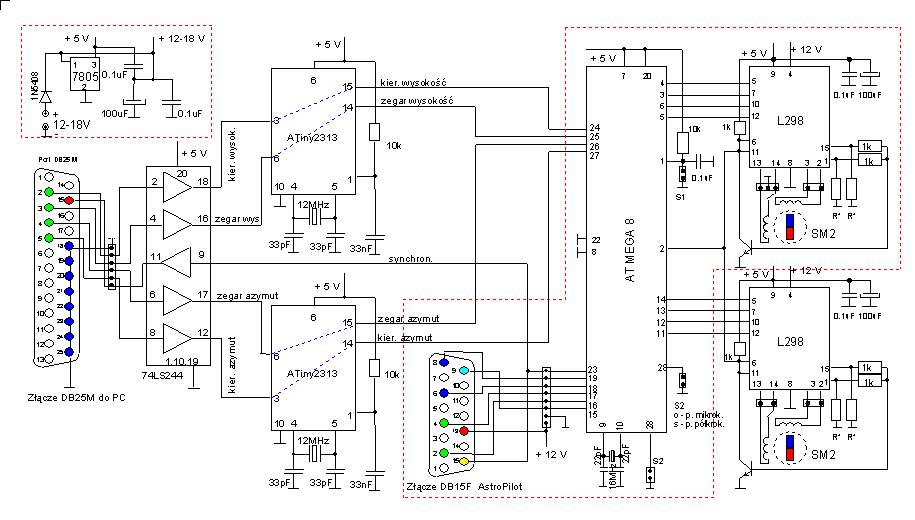 | Kompletny uklad elektroniki systemu gotopl (bufory, normalizator, przełącznik sygnalu i podwójny sterownik silników krokowych bipolarnych) | Pełny układ ze sterowaniem dla dwóch silników - cena XXX PLN, Układ zawiera 2 normalizatory sygnału (ATiny2313), automatykę i sterowanie mikrokrokowe (ATMega8) i 2 wzmacniacze mocy L298 dla silników krokowym bipolarnych (ale pracują też silniki unipolarne). Napięcie zasilania od 6 do 18V, Może pełnić ograniczone funkcje jak układopisany powyżej ale jest najbardziej kompletnym układem działającym z AstroPilotem i programem goto pl do sterowania teleskopami paralaktycznymi i azymutalnymi. |