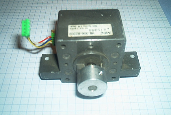Silnik bipolarny (4 wyprowadzenia), NEC HB-306-B2202, 12V, oporność uzwojenia 150 omow, 1.8 stopnia/krok, moment prawdopodobnie ok.10-20 Ncm. Wymiary: 40/40/30mm, oś średnica 5mm, na osi znajduje się koło o średnicy 17mm i wysokości 10mm, dlugość osi 12mm, mocowanie wkrętami M3, 4 na w rozstawie 31mm lub 2 w rozstawie 59mm. Zastosowanie: motofocuser, napęd teleskopu z przekladnią co najmniej 1:10