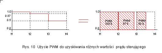 Rysunek 10 pokazuje w jaki sposób można uzyskać prądy sterujące mieszczące się w zakresie pomiędzy wartością maksymalną a zerem przy stosowaniu wyłacznie logiki binarnej. Do uzyskanie dopowiedniego efektu wykorzystuje się tzw modulację szerokości impulsu (PWM). Na lewym rysunku widać, że prądy o wartości 1, 0.87 i 0.5 utrzymywane są w trakcie trwania równych okresów czasu (t2-1), (t3-t2) oraz (t4-t3). Biorąc pod uwag efekt energetyczny pokazanych sygnałów można powiedzieć, że zmienna o wartości 0.5 działająca w czasie (t4-t3) wywoła podobny efekt jak zmienna o wartości 1 działająca w czasie (t4-t3)/2. Podobnie zmienna o wartości 0.87 działająca w czasie (t3-t2) wywoła podobny efekt jak zmienna o wartości jeden działająca w czasie (t3-t2)*0.87. W ten sposób, kierując czasem działania zmiennej o pełnej wartości w trakcie trwania impulsu uzyskuje się efekt podobny do użycia wielkości o zmiennej amplitudzie działającej w ciągu całego czasu trwania impulsu. Opisane działania uwarunkowane są pewnymi warunkami, z których najważniejszy polega na tym, że zmiany długości trwania pojedynczego impulsu sterującego muszą być zbyt szybkie do 'zauważenia' przez sterowany obiekt, który dostrzega wyłącznie średnią wartość zmian nie mogąc zareagować na szybko zmieniające się wartości chwilowe. O takich własnie obiektach mówimy, że są inercyjne dla szybkich sygnałów sterujących. Rzeczywiście Wirnik silnika krokowego wnosi sporą inercję a uzyskiwane prdkości obrotowe silników sięgają kilku obrotom na sekundę co odpowiada 5-10 tysięcy mikrokrokom na sekundę. Sterowanie wypełnieniem impulsu powinno odbywać się zatem co najmniej 10 razy szybciej a zatem z prędkościami rzędu 100 tysięcy i więcej zmian w ciągu sekundy. |