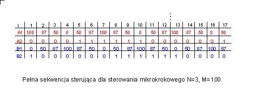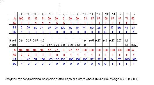 | Przy sterowaniu z podziałem kroku podstawowego na mniejsze części długość sekwencji sterującej się wydłuża. Dla przykładu w tabeli podano wartości pierwszych 17 kroków sekwencji z podziałem kroku podstawowego na 6 części (N=6). Dla takiego sterowania pełna sekwencja elektryczna ma długość 24. Górne wiersze tabeli zakładają zmianę prądu sterowania zgodnie z wartościami jakie przybierają odpowiednio funkcje sin i cos. W środkowej części tabeli znajdują się wyliczenia proporcji wzajemnych wartości A(I) oraz B(I). Wykorzystując fakt, że położenie wirnika zależy od stosunku prądów w uzwojeniach można uprościć sekwencję sterującą zakładając dla jednej z wartości stały poziom sygnału równy 100 jednostek (PWM =100%) i odpowiednio podnosząc wartość drugiego z sygnałów. W ten sposób np. dla kroku I=3 wartości sterowania wynoszą odpowiednio: A1(3)=87 (PWM=87%), B1(3)=50 (PWM=50%) i należy zastosować dla obu sygnałów impulsy wypełnione odpowiednio w 87 i w 50 procentach. Ale jednocześnie wzajemny stosunek wielkości A1(3) i B1(3) wynosi 0.57. Jeśli więc zmienna A1(3) równać się będzie 100 (PWM=100%) to zmienna B1(3) powinna mieć wartość 57 (PWM=57%) co zapewni, że pozycja wirnika będzie identyczna. Przez taką manipulację uzyskuje się 2 efekty: jednym z nich jest zwiększenie momentu silnika, bo steruje się go zawsze prądem o maksymalnej wartości w co najmniej jednym z uzwojeń, po drugie upraszcza się sekwencję sterującą bo musi ona zawierać tylko 4 wartości a nie jak poprzednio 7 wartości. Taka uproszczona sekwencja wyróżniona została pogrubioną ramką. Sekwencja ta powtarza się w różnych miejscach okresu sterowania elektrycznego i dla przykładu sekwencja dla zmiennej B1 z zakresie od I=1 do I=6 powtarza się dla zmiennej A2 od I=7 do I=12. Realizując algorytm sterowania można pójść dwiema drogami. Można użyć pełnej tabeli sterowania dla danego podziału kroku podstawowego na N mikrokroków co skutkuje koniecznością budowania tabel o długościach N*4 albo można zastosować metodę używania podstawowej sekwencji o długości równej N dopasowywanej do miejsca w cyklu kroku elektrycznego. Pierwszy sposób wymaga większej pamięci, drugi szybszego procesora bo ilość operacji związanych z dopasowaniem sekwencji zwiększa się. Stała pozostaje konieczność wykonania wszystkich N*4 sekwencji sterujących z tabel A1 i B1 oraz zachowanie znaków sygnałów sterujących z tabel A2 i B2. | ![]() |