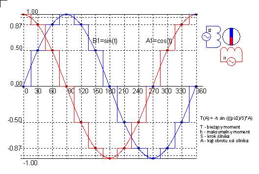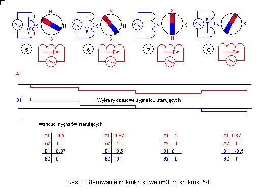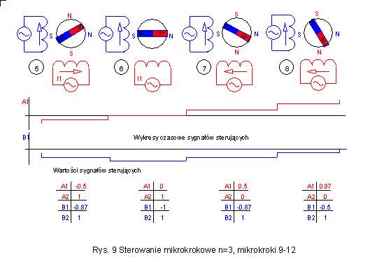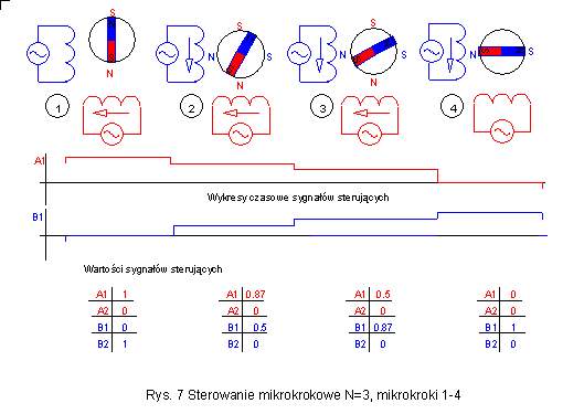 Dla sterowanie mikrokrokowego prądy w uzwojeniach nie mogą być już jak przy sterowaniu pełno i półkrokowym kombinacją prądu maksymalnego lub zerowego. Sterowanie mikrokrokowe wymaga używania prądów mieszczących się pomiędzy wartością amksymalną a zerem. Na przykładzie sterowania z podziałem kroku na 3 (N=3) części widać, że do uzyskania prawidłowego sterowania prądy muszą przybierać wartości równe 0.5 oraz 0.87 wartości maksymalnej. |