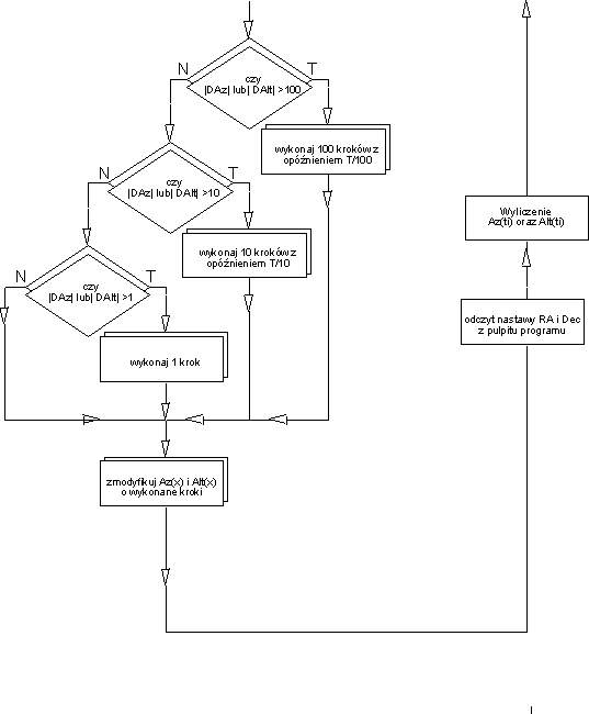 Rysunek 2. Algorytm część 2. Ustawienia danych do sterowania można zmieniać w każdej chwili działania algorytmu. Wprowadzenie na przykład innych współrzędnych ciała niebieskiego powoduje niezwłoczne przeliczenie oraz wyliczenie błędu sterowania, który wynosić może setki lub tysiące kroków. Niezwłocznie też algorytm generuje ciągi impulsów dla silników w obu osiach. W tym trybie można mówić o pracy napędu typu GOTO. Dla zmniejszenia opóźnień w działaniu interface programu przestawienie odbywa się 'skokami' po nie więcej niż 100 kroków w każdej pętli algorytmu. Jednocześnie regulowana jest częstotliwość impulsów w taki sposób aby była ona proporcjonalna do ich ilości. Zapewnia to 'łagodne' dojście do ustalonej pozycji. Przestawianie napędu jest dość szybkie. Dla przykładu zmiana położenia w azymucie o 90 stopni trwa kilka sekund. |