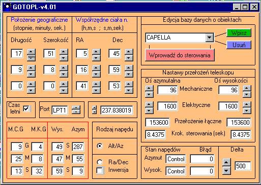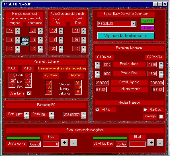 Rysunek 3. Interface programu działającego sterownika napędu MTO. Program działa z każdym systemem operacyjnym Windows. Wstępnie należy ustawić dane dotyczące swojego położenia geograficznego i wybranego ciała niebieskiego (Ra/Dec) a także parametry wypadkowej przekładni elektryczno-mechanicznej. Program oblicza czas gwiazdowy i miejscowy kąt godzinny, współrzędne Alt i Az oraz nastawy dla silników krokowych. Program ma własną bazę danych ciał niebieskich, którą można edytować. Program może obsługiwać montaże sytemów Ra/Dec oraz Alt/Az. Program zapamiętuje ostatnio ustawione dane i otwiera się pamiętając dane z momentu ostatniego zamknięcia. Tu możesz pobrać samorozpakowujący się plik (166kB), który należy wgrać koniecznie na dysk C: (np. do kartoteki C:\goto) i rozpakować. W pliku znajdziesz dokumentację (213kB) oraz właściwe pliki programowe.