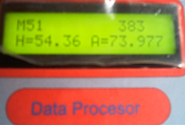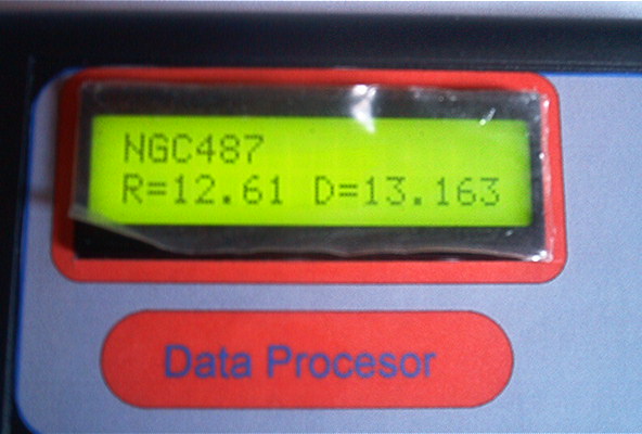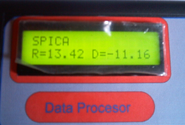 | Po dokonaniu wyboru obiektu system przestawia montaż do nowego położenia określonego współrzędnymi lokalnymi H i A co sygnalizowane jest także liczbą impulsów do wykonania w obu osiach łącznie. Na pokazanym rysunku trwa właśnie przestawianie montażu na obiekt M51 a montaż ma jeszcze do przebycia 383*100=38300 kroków silników w obu osiach licząc łącznie.