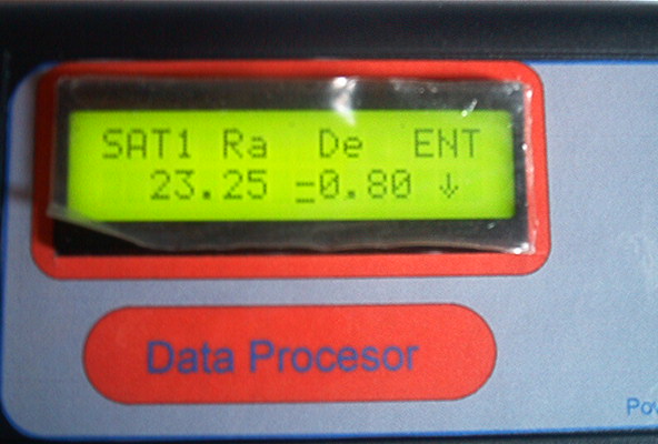 | Jeśli została ustalona nazwa własnego obiektu to system przechodzi do procedury określenia jego parametrów Ra i Dec w zapisie dziesiętnym . Kursor można przemieszczać pomiędzy współrzędną Ra i Dec za pomocą klawisza (<-) a zmianę wartości konkretnej współrzędnej umożliwiają klawisze strzałek w górę i w dół. Zatwierdzenie ustalonych wartości współrzędnych odbywa się po ustawieniu kursora na symbolu strzałki i zatwierdzeniu klawiszem strzałki w dół. Współrzędne obiektu należy podawać w systemie dziesiętnym zamieniając dane wyrażone w godzinach, minutach i sekundach oraz w stopniach, minutach i sekundach na godziny i stopnie wyrażone w systemie dziesiętnym. Dla przykładu, jeśli współrzędne obiektu wynoszą Ra = 23 godziny 15 minut i 23 sekundy oraz Dec =47 stopni, 46 minut oraz 18 sekund to należy wprowadzić dane: Ra = 23 + 15/60 + 23/3600 = 23.26 oraz De = 47 + 46/60 + 18/3600 = 47.77. Zatwierdzenie danych odbywa się na pozycji sybolu strzałki z użyciem klawisza strzałki w dól na AstroPilocie a system wraca do głównego poziomu menu. |