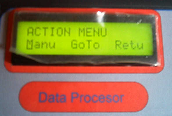 | Procedura ta jest główną procedurą systemu pozwalająca na śledzenie i wyszukiwanie obiektów a także na pracę ręczną i ręczną korektę położenia obiektów w trakcie śledzenia. W tym trybie do wyboru jest możliwa praca manualna za pomocą AstroPilota (Manu) lub praca goto (GoTo). Powrót do głównego menu umożliwia opcja Retu (Return). Wybór opcji odbywa się za pomocą klawisza strzałki (<-) a zatwierdzenie wybranej opcji za pomocą strzałki w dół na AstroPilocie. |