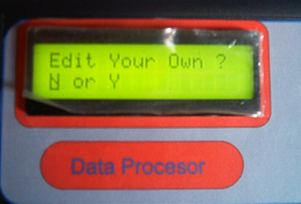 | Jeśli na pytanie o edycję własnej bazy obiektów zostanie udzielona odpowiedź Y (Yes) wtedy otwiera się okno edycji własnej bazy danych. Własna baza danych ma pojemność 10 obiektów. Początkowy ekran edycji pozwala na wybór obiektu podlegającemu edycji. Przewijanie odbywa się za pomocą klawisza strzałki w dół , wybór za pomocą strzałki (<-) . Numer wybranego obiektu pokazany jest z lewej strony dolnego wiersza a obok jego nazwa. Po wyborze obiektu do edycji otwiera się okno edycji jego nazwy. Nazwa może liczyć do 4 znaków. Zmiana edytowanej pozycji nazwy wykonywana jest za pomocą klawisza (<-) a jego wartość (0-0, A-Z) zmieniana jest za pomocą klawiszy strzałek w górę i w dół. Uzycie klawisza (<-) na ostaniej pozycji edytowanej nazwy zamyka edycję nazwy obiektu umożliwiając edycję parametrów tego obiektu. |