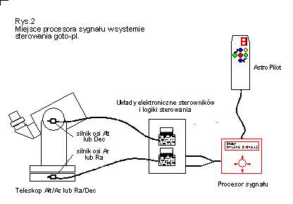 | Na rys. 1 i 2 pokazana została konfiguracja systemu sterowania w przypadku używania komputera PC (rys.1) oraz procesora sygnału (rys.2). Podczas pracy z komputerem PC AstroPilot dołączony jest bezpośrednio do sterownika mikrokrokowego, podobnie jak i komputer PC z pracującym programem goto pl. Połączenie sterownika mikrokrokowego z komputerem PC odbywa się za pomocą prostego kabla z końcówkami DB25F i M. Kabel ten może mieć długość co najmniej 10m. AstroPilot dołączony jest także bezpośrednio do sterownika mikrokrokowego. Jeśli do sterowania używany jest procesor sygnału to wymagany jest dodatkowy, podwójny kabel łączący procesor sygnału ze sterownikiem. Kabel ten zakończony jest od strony sterownika wtykiem DB25F skąd zostaje rozdwojony na część zakończoną wtykami DB25F oraz DB15M służącymi do podłączenia do sterownika mikrokrokowego. Praca ręczna (sterowanie za pomocą AstroPilota) możliwe jest kiedy układ działa z PC, z procesorem sygnału lub też wyłącznie z dołączonym AstroPilotem. |