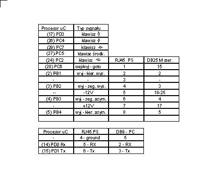 Tabele podają opis sygnałów na poszczególnych gniazdach procesora sygnału. Stanowią zarazem opis kabli połączeniowych jakie są potrzebne do połączenia procesora ze sterownikiem silników krokowych oraz z portem RS232 PC. Wszystkie rysunki znajdują się w pliku word-a |