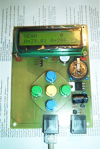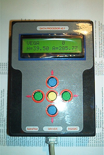 | Nowa wersja (v3.0) procesora sygnału prawie całkowicie zastępuje komputer PC do sterowania napędem teleskopu. Układ jest kompatybilny ze sterownikiem silników krokowych systemu goto pl i może działać równolegle z AstroPilotem lub całkowicie bez AstroPilota. Układ zawiera bazę ok. 600 obiektów (w tym wszystkie M i ponad 80 najjaśniejszych gwiazd), pozwala na dowolne ustawienie parametrów montażu (rodzaj montażu i wielkości przekładni dla każdej z osi), umożliwia też ustawienie parametrów miejsca obserwacji (długość i szerokość geograficzną). Sercem procesora sygnału jest mikrokontroler AT MEGA 32 (32kB pamięci flash) z zegarem 8MHz. Układ zawiera wyświetlacz LCD 2*16 znaków, zegar czasu rzeczywistego z podtrzymaniem bateryjnym, klawiaturę 5 przyciskową oraz 2 gniazda RJ45 dla podłączeń zewnętrznych Całe urządzenie mieści się w obudowie 125/95/25mm a przednia strona chroniona jest ozdobną maskownicą.