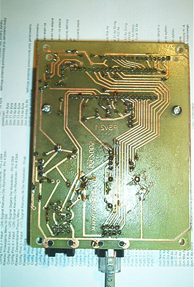| Płytka drukowana jest jednostronna i z konieczności wymaga do prawidłowego działania kilku dodatkowych zwor. Główna płytka drukowana wspiera także płytkę drukowaną klawiatury, która wlutowana jest w płytkę podstawową na 7 przewodach o średnicy 0.8-1 mm. | ![]() |