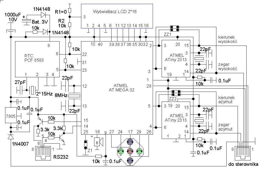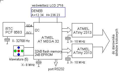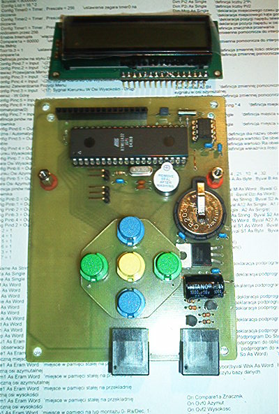 Do podłączeń zewnętrznych służą dwa gniazda RJ45. Jedno z nich zapewnia połączenie ze sterownikiem silników krokowych a drugie jest portem RS do przyszłych zastosowań (głownie do konfiguracji za pomocą komputera PC) Wyświetlacz LCD 2*16 znaków wspiera się na łączówce sygnałowej oraz na 2 gwintowanych tulejkach 10mm. Stałą pracę zegara czasu rzeczywistego zapewnia potrzymanie bateryjne z baterii 3V używanej w sprzęcie PC. U dołu procesora, po jego prawej stronie widoczny jest także brzęczyk współdziałający z klawiaturą. Przybliżony koszt wykonania urządzenia to: procesor ATMEGA 32 (25PLN), wyświetlacz LCD (32PLN), zegar RTC (9PLN), obudowa (4.5), bateria (5.5PLN), rezonatory kwarcowe (1.5+2=3.5PLN), gniazda RJ45 (2*3.5=7PLN), inne (stabilizator, tranzystory, oporniki i kondensatory, elementy mechaniczne, w tym płytki drukowane, - razem ok. 16PLN) co w sumie daje ok. 105 PLN. W wersji rozbudowanej o normalizator sygnału należy doliczyć jeszcze 2 uklady ATiny 2313 za ok. 20 PLN. |