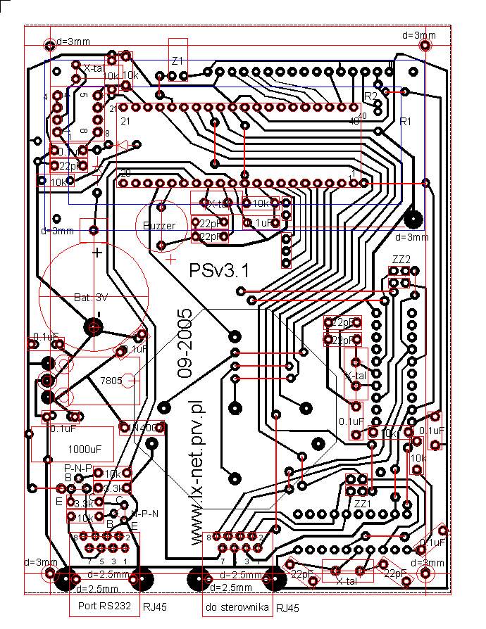 Montaż urządzenia należy rozpocząć od wykonania płytek drukowanych i wszystkich otworów, w tym do mocowania w obudowie (4 otwory 3mm), do mocowania wsporników wyświetlacza (2 otwory 3mm) oraz do mocowania gniazd RJ45 (4 otwory 2.5mm). Następnie należy wykonać wszystkie zwory zaznaczone na rysunku na czerwono. W następnej kolejności należy zmontować płytkę wspierającą klawisze, którą wlutowuje się na przewodach o średnicy 0.8-1mm w taki sposób aby jej odległość od płytki głównej wynosiła 4-6mm. Układ zmontowany poprawnie powinien startować samodzielnie bez problemów. |