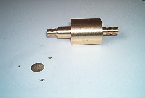 Po wyschnięciu kleju uzyskujemy całkowicie wypełniony otwór, w którym należy wyznaczyć środek dalszego wiercenia. Widoczne na zdjęciu małe otwory stanowią pozostałość po poprzednim systemie łożyskowania montażu. |