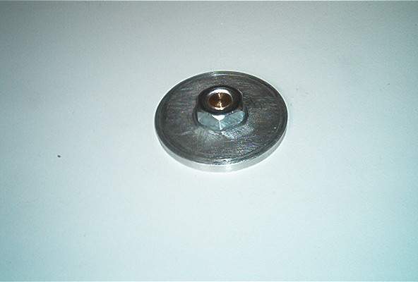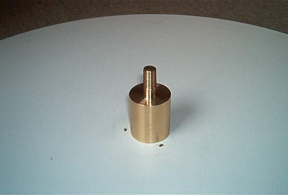 Oś azymutalna - w tym przypadku zrobiona z mosiądzu - to walec o średnicy 32mm zakończony z jednej strony odcinkiem nagwintowanym o średnicy 14mm (taki otwór jest właśnie w nieruchomej podstawie teleskopu) a z drugiej strony zakończony nagwintowanym odcinkiem o średnicy 10mm (taki otwór ma koło napędowe osi azymutalnej). Duża średnica osi azymutalnej (32mm) wynika z konieczności zachowania odpowiedniej sztywności konstrukcji co pozwala jednocześnie na prawidłowe ułożenie poszczególnych elementów montazu względem siebie. |