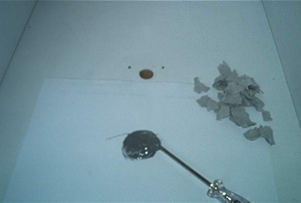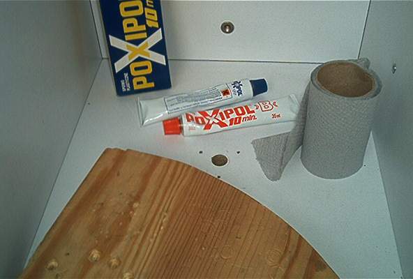 | Podstawę należy ustawić na kawałku deski aby klej nie wyciekł z otworu a następnie po wymieszaniu kleju (ok. 1.5-2cm z każdej tubki) należy wprowadzać go do otworu mieszając go w otworze ze ścinkami papieru. Otwór należy wypełnić klejem po brzegi starając się zachować zarys istniejącego otworu co pozwoli na właściwy wybór środka wiercenia. | ![]() |