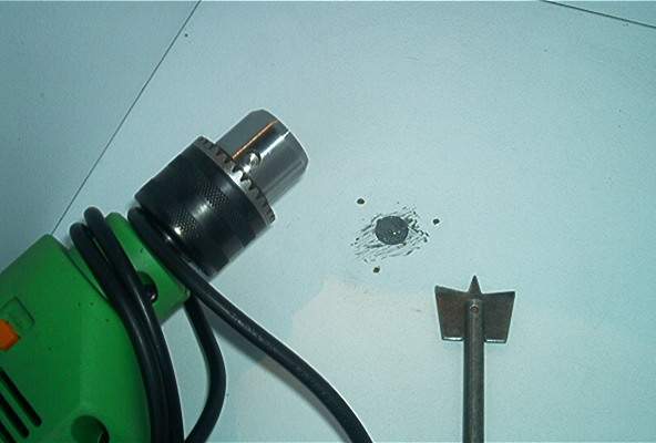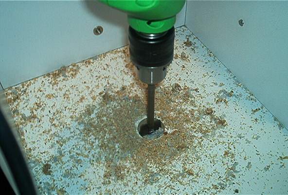 | W trakcie wiercenia należy zwracać uwagę aby wiertło 'nie schodziło' z wyznaczonego kierunku. Nie ma znaczenia krytycznego bowiem właściwe łożyskowanie i tak zapewnia metalowy pierścień ale oszczędzi to nieco pracy związanej z koniecznością wyrównywania otworu. | ![]() |