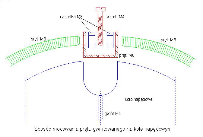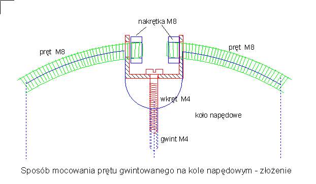| Rysunek złożeniowy pokazuje w jaki sposób należy połączyć wszystkie elementy mocowania śruby napędowej. Ten system mocowania pozwala na właściwe naciągnięcie śruby na obwodzie koła za pomocą nakrętek M8 wspartych na kątowniku C. Pozwala to na użycie dłuższej śruby i stopniowe jej skracanie (o ok. 1 cm) w miarę jak następuje dopasowywanie krzywizny śruby do krzywizny koła napędowego. System naciągu i mocowania śruby napędowej na kole ogranicza ruch napędu w osi azymutalnej granicach ok. 30 stopni co nie powinno stanowić istotnego ograniczenia w obserwacjach. | ![]() |