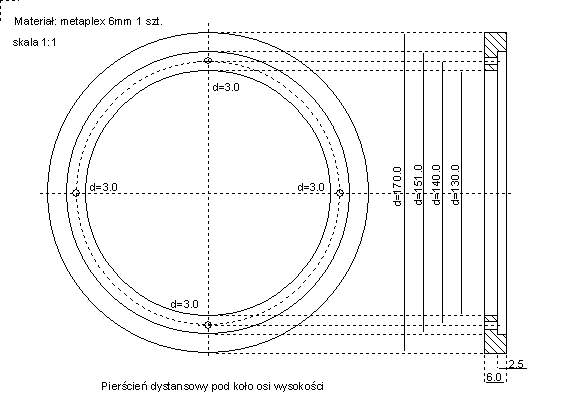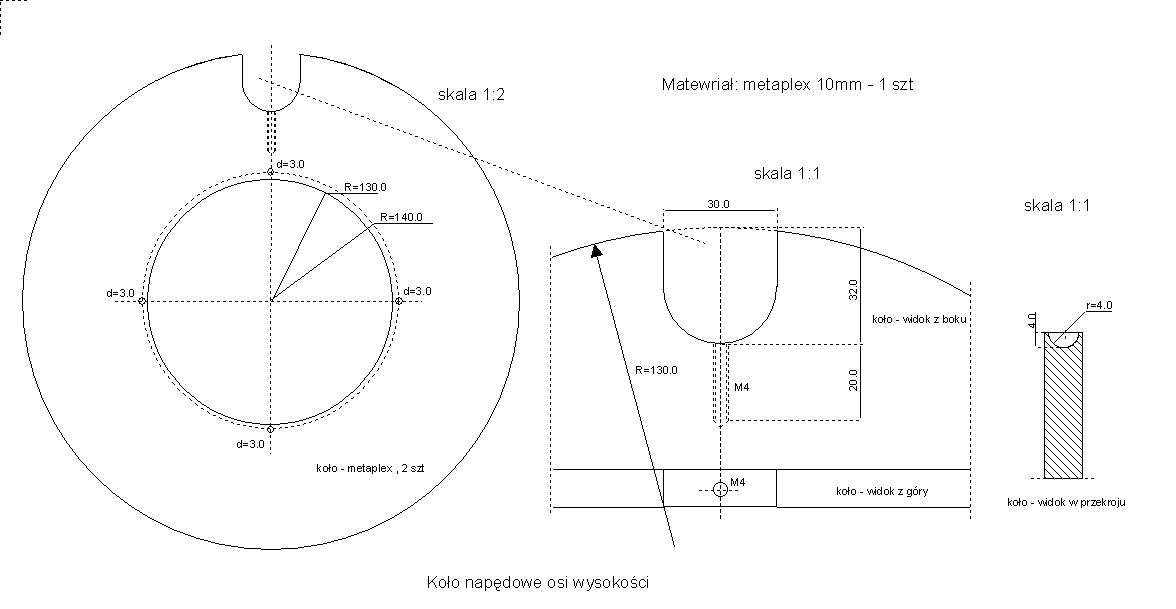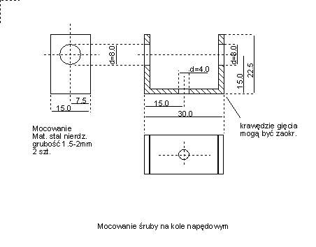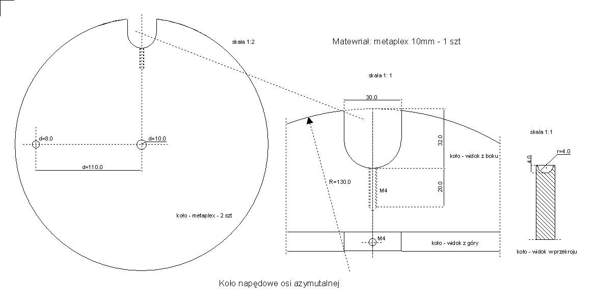 . Koła napędowe w obu osiach wykonane są podobnie z metaplexu o grubości 10mm i mają zewnętrzny wymiar równy 260mm. Koła mają na obwodzie wybranie półokrągłe o promieniu 4mm dla prawidłowego ułożenia w nim wygiętej w okrąg śruby napędowej M8. Oba koła mają też identyczny sposób mocowania i napinania śruby M8. Sposób wykonania tego elementu podaje pierwszy z rysunków. W kole wykonane jest wybranie o szerokości 30mm i głębokości ok. 45mm do którego pasuje wygięty w kształcie litery C kątownik stalowy - zwornik , w którym znajdują się na bokach dwa otwory o średnicy 8mm oraz jeden otwór o średnicy 4mm. W większe otwory wsuwa się końcówki śruby M8 natomiast przez mniejszy otwór przechodzi śruba M4 wkręcana w koło i utrzymująca kątownik (końce śruby M8) we właściwym położeniu. Kątownik ten stanowi oparcie dla nakrętek M8, które napinają i wyrównują śrubę M8 na okręgu koła napędowego. Koło napędowe osi azymutalnej ma centralny otwór 10mm na oś azymutalną i otwór na brzegu (8mm) na mocowanie ogranicznika obrotu w tej osi. Koło napędowe osi wysokości ma centralny otwór 130mm w celu nasadzenia koła na czop tubusa teleskopu oraz 4 otwory 3mm mocujace koło do czopa. Dodatkowo, koło to musi współpracować z pierścieniem dystansowym montowanym pomiędzy czopem a kołem w celu ustawienia koła w odpowiedniej odległości do mechanizmu napędowego osi wysokości. |