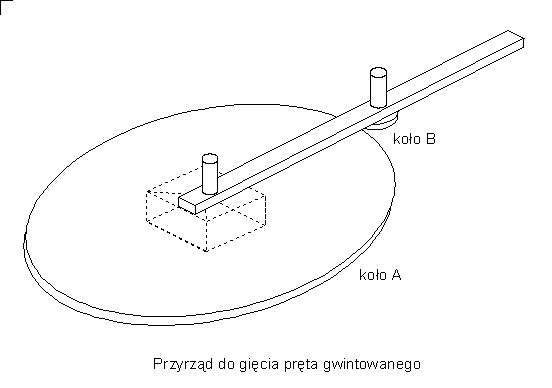 Do odpowiedniego wygięcia pręta gwintowanego przed założeniem na koło napędowe może pomóc przyrząd pomocniczy pokazany symbolicznie na załączonym rysunku. Przyrząd składa się z dużego koła A o średnicy 220mm, do którego przez otwór centralny dołączono dźwignię z małym kołem B umieszczonym na dźwigni w takiej odległości, że pomiędzy kołami A i B mieści się pręt gwintowany. Koło A powinno mieć wysokość nie mniejszą niż 10mm a najlepiej gdy dodatkowo ma podtoczoną bruzdę jak dla koła napędowego. Na rysunku w centralnej części koła A narysowano linią przerywaną element umożliwiający zamocowanie koła A w imadło. Jeśli koło A wykonane zostanie np. ze sklejki to elementem tym może być np. klocek drewniany połaczony z kołem A śrubami lub gwoździami. Koło B powinno mieć średnicę od 15 do 30mm oraz powinno być wykonane z materiału bardziej miękkiego niż stal pręta gwintowanego (np. mosiądz lub tworzywo sztuczne). Na rysunku nie zaznaczono jeszcze jednego elementu konstrukcyjnego służącego do zamontowania końca pręta gwintowanego do koła A przed wygięciem. Takim elementem może być np. dokręcony do bocznej powierzchni koła A kątownik z otworem 8mm w który należy włożyć pręt z nakrętką przed rozpoczęciem gięcia. Pokazany system może służyć do gięcia śrub także do innych celów np. do konstrukcji 'koziołka'. Należy pamiętać, że pręt po zwolnieniu z przyrządu 'rozpręża się' zwiększając promień gięcia mniej więcej w proporcji 1.3 a więc aby wygięty pręt miał średnicę ok. 260mm to powinien być gięty na kole o średnicy ok. 200mm. |