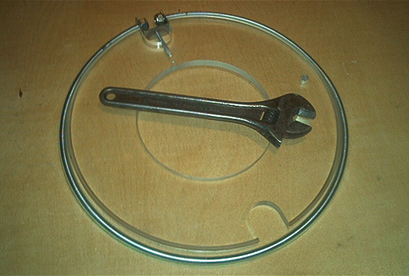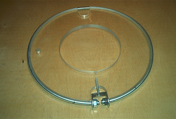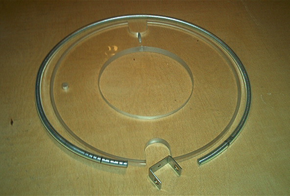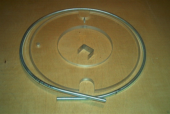 . Koła napędowe składają się z koła metaplexowego, wygiętego pręta gwintowanego M8 i zwornika w kształcie litery C do połączenia pręta na obwodzie koła. Widoczne na zdjęciu koło ma dwa podfrezowania wykonane symetrycznie na obwodzie ale nie one są zamierzonym elementem konstrukcyjnym. Jest to pomyłka frezera, który 'z rozpędu' zrobił dwa podfrezowania. Pokazane na zdjęciu koło jest kołem osi wsokości ale podobnie składa się koło azymutalne. |