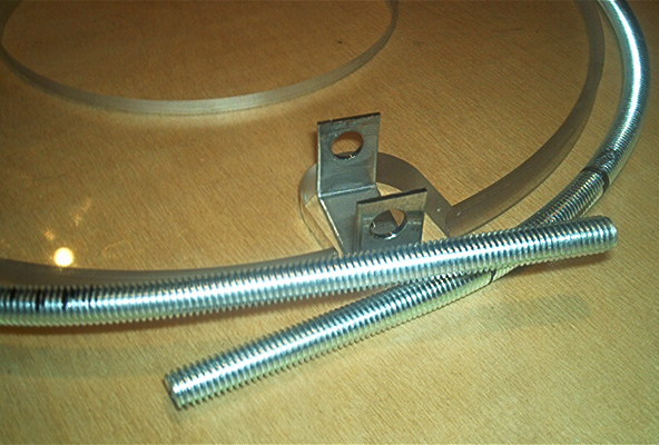 | Pręt gwintowany powinien być tak wygięty aby zachowywać kształt koła mniej więcej na długości 82-85cm. Dlatego początkowa długość pręta jaki jest wyginany powinna wynosić 100cm bo zwykle nie udaje się precyzyjnie wygiąć obu końców pręta. Wydaje się, że długością właściwą do złożenia koła jest 82 cm pręta a zatem należy odciąć z wygiętego pręta , na obu jego końcach, odcinki dające w sumie 18 cm (przy założeniu, że pręt miał początkowo 100cm). Na tym zdjęciu widać przygotowany już do założenia na kole pręt o długości 82cm. |