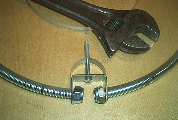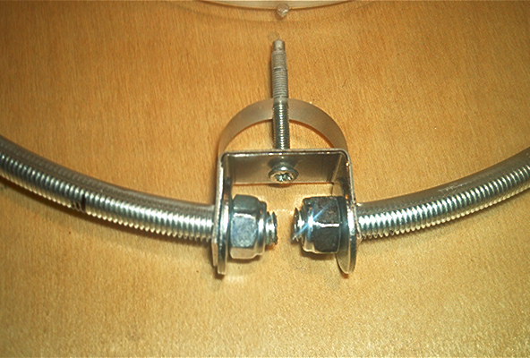 Wydaje się, że jeśli do wykonania koła napędowego użyje się pręta o długości 82cm to będzie można nadmiar długości pręta 'zgubić' dociągając śrubami w całym możliwym zakresie wewnątrz zwornika. Na pokazanym zdjęciu pomiędzy śrubami a zwornikiem znajdują się podkładki pod śrubę M8 stabilizujące dodatkowo konstrukcję zwornika. Wydaje się, że zwornik nie może być wykonany z blachy cieńszej niż 2mm a grubość 3mm wydaje się być optymalną. Wszystkie opisywane ustalenia dotyczą oczywiscie koła o średnicy 260mm i preta M8