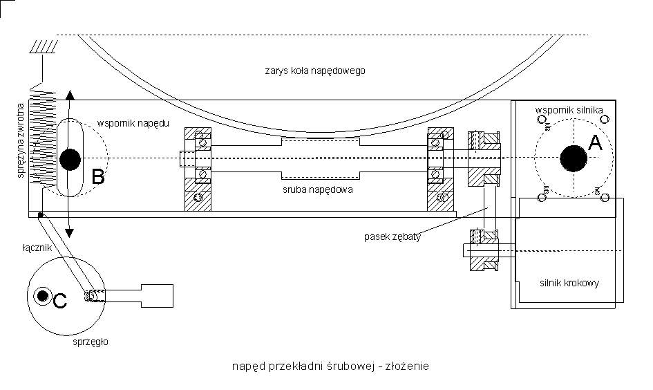 Działanie napędu najlepiej widać na rysunku złożeniowym. Do podstawy zamocowane są wsporniki (łożyskujące śrubę napędową) oraz silnik na wsporniku. W punkcie oznakowanym jako A znajduje się oś wokół której może się obracać podstawa napędu przez co śruba napędowa może być złączona z kołem napędowym lub od niego odsunięta. Na przeciwległej stronie napędu wykonany jest podłużny otwór w którym znajduje się druga oś podstawy pozwalająca na ograniczony obrót podstawy wokót punktu A. Osie A i B posiadają szerokie kołnierze dociskające podstawę napędu do podstawy ruchomej teleskopu lub jego bocznego wspornika likwidując luzy w obu osiach. Właściwe położenie śruby napędowej zapewnia sprężyna mocowana do podstawy napędu w pobliżu punktu B. Sprężyna dociska śrubę napędową do kola napędowego a siłę nacisku można regulować poprzez odpowiedni naciąg sprężyny. Z drugiej strony sprężyny znajduje się sprzęgło mimośrodowe wykonane jako koło z dźwigienką mocowane mimośrodowo do podstawy montażu. Zmiana położenia łącznika w zależności od kąta obrotu mimośrodu pozwala na odciągnięcie podstawy wraz ze śrubą napędową na taką odległość od koła napędowego, że następuje odłączenie napędu od osi teleskopu. Po odłączeniu napędu możliwa jest także swobodna praca ręczna.. |