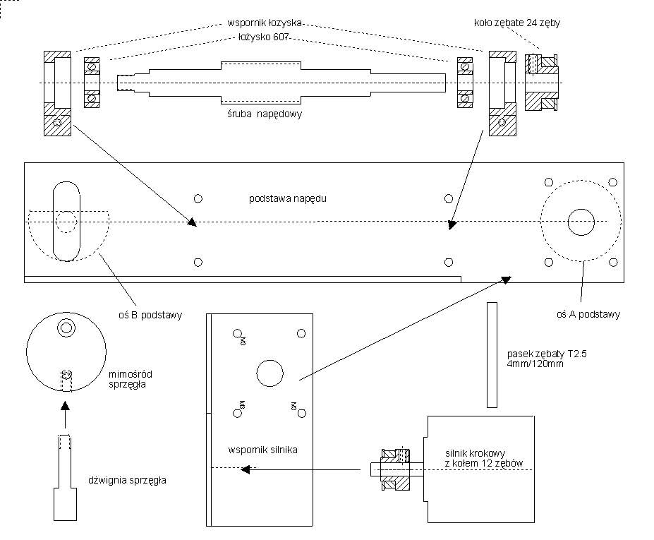 .Obie osie teleskopu napędzane są za pomocą jednakowych systemów napędowych co pozwoli na uproszczenie konstrukcji mechanicznej. Podstawa napędu zrobiona jest z profilu aluminiowego C 25/45/2.5mm, na którym zamocowana jest łożyskowana śruba napędowa i wspornik silnika z silnikiem i paskową przekładnią synchroniczną. Uzupełnieniem konstrukcji napędu jest sprzęgło mimośrodowe pozwalające na błyskawiczne odłączenie napędu od teleskopu co daje możliwość doraźnego przestawienia teleskopu w żądany obszar nieba lub pozwala na pracę ręczną montażu. Działanie napędu a w szczególności sprzęgła wspomaga sprężyna powrotna regulująca jednocześnie docisk śruby napędowej do koła napędowego. |