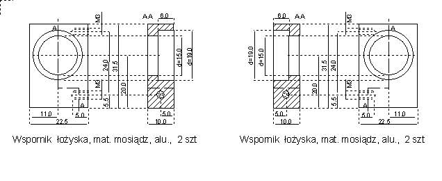 | Łożyska śruby napędowej zamocowane są w prostopadłościennych wspornikach z wybraniem na łożyska. Łożyska są wklejone do wsporników za pomocą niewielkiej ilości kleju poxipol po wcześniejszym odtłuszczeniu powierzchni łożyska i wspornika za pomocą denaturatu. Należy zwrócić uwagę, że na komplet łożyskowania wchodzą 2 wsporniki (prawy i lewy) stanowiące swoje wzajemne odbicie lustrzane. | ![]() |