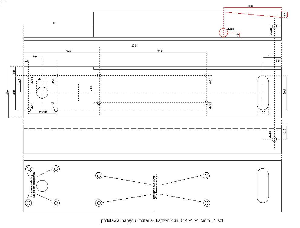 Podstawa napędu wykonana jest z profilu aluminiowego C 25/45/2.5mm z którego usunięta została jedna boczna ścianka i część drugiej ścianki w pobliżu miejsca gdzie mocowany jest wspornik silnika z silnikiem. Na brzegach podstawy napędu wykonane są otwory łożyskujące ruch podstawy zapewniający dołączanie i odłączanie napędu od koła napędowego dla każdej z osi. Jeden z otworów łożyskujących jest otworem podłużnym dającym możliwość obracania podstawy względem drugiego punktu łożyskowania. Wszystkie otwory na śruby mocujące inne elementy napędu (wspornik silnika i wsporniki łożysk śruby napędowej) a znajdujące się na spodniej stronie wspornika przylegającej do podstawy montażu muszą być fazowane pod wkręty z łbem stożkowym aby zapewnić rownoległość podstawy napędu z podstawą montażu. |