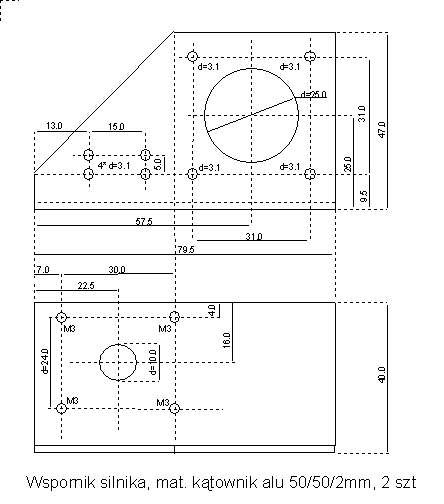Przykręcony do podstawy wspornik silnika krokowego zapewnia właściwą odległość osi silnika od osi śruby napędowej niezbędną dla bezluzowego działania synchronicznej przekładni paskowej. Ponieważ otwory mocujące silnik są nieco przewymiarowane to istnieje niewielka możliwość regulacji naciągu paska zębatego przekładni pozwalająca na likwidację luzu jaki może negatywnie wpływać na pracę montażu szczególnie przy zmianie kierunku ruchu w każdej z osi. Do wykonania napędu nalezy używac silników o rozstawie śrub mocujących 31mm w kwadracie. Przykładem może być silnik bipolarny 39BYGH101B z firmy Wobit. |