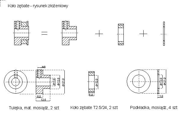 | Synchroniczna przekładnia paskowa zapewnia przełożenie ruchu osi silnika na śrubę napędową z przełozeniem 2:1 co oznacza dwukrotną poprawę rozdzielczości sterowania z jednoczesnym zwiększeniem momentu napędowego działającego na koło napędowe dla każdej z osi. Przekładnia ta składa się z pary kół zębatych o 12 zębach (na osi silnika krokowego) i o 24 zębach (na śrubie napędowej) oraz z paska zębatego o długości 120mm. Komplet kól i paska wykonany jest w standardzie T2.5 co oznacza, że odległość pomiędzy zębami wynosi 2.5mm. Szerokość paska wynosi 4mm co jest wiekością typową a jego długość wynosi 120mm. W handlu spotkać można także gotowe koła zębate o 12 i 24 zębach w których należy wykonać tylko otwór centralny dopasowując koło do używanej osi. Alternatywą dla gotowych kół jest wykonanie ich z wałków zębatych co pozwala znacznie zmniejszyć koszty tych elementów. Na rysunku podano sposób wykonania większego koła zębatego z wykorzystaniem pierścionka zębatego odciętego z wałka T2.5/24. Średnica wewnętrzna tego koła dopasowana jest do średnicy śruby napędowej. Silniki krokowe o użytej do napędu wielkości mają średnice osi 5mm a więc mniejsze koło zebate musi mieć otwór centralny równy 5mm. | ![]() |