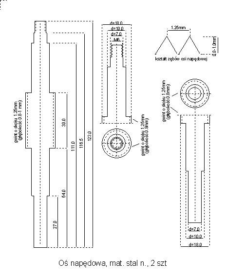 | Głownym elementem roboczym układu napędowego jest śruba gwintowana wykonana ze stali nierdzewnej. Śruba ta łożyskowana jest za pomocą dwóch łożysk typu 607 RS (19/6/7mm) umieszconych we wspornikach łożysk. Na jednym z końców śruby napędowej montowane jest koło zębate o 24 zębach współpracujące poprzez pasek zębaty T2.5/4/120mm z kołem o 12 zębach na wale silnika krokowego. Cechą znamienną śruby napędowej jest jej średnica - 18mm dająca dobrą powierzchnię styku naciętego na śrubie gwintu M8 z gwintem śruby na kole napędowym. | ![]() |