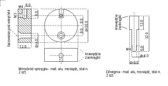 | Sprzęgło napędu wykonane jest w formie koła z mimośrodowym mocowaniem do podstawy. Do jednego z boków koła wkręcona jest dźwignia ułatwiająca operowanie sprzęgłem. Wgórną powierzchnię koła mimośrodowego wkręcony jest także wkręt M3 pozwalający na zamontowanie łącznika pomiędzy kołem a podstawą napędu. Po przeciwnej stronie podstawy napędu zamocowana jest sprężyna powrotna zapeniająca właściwy docisk śruby napędowej do koła i właściwe działania mimośrodu sprzęgła. Ruch sprzęgła ograniczony musi być za pomocą odpowiednio umieszczonego w podstawie montażu sztyftu metalowego (wkrętu) na którym oprze się dźwignia sprzęgła po przekroczeniu punktu równowagi i odciągnięciu śruby napędowej od koła.. | ![]() |