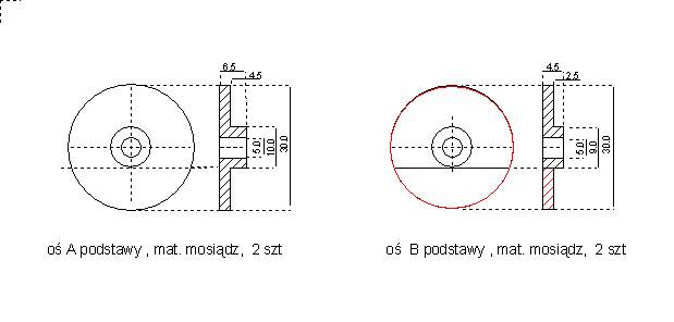 | Łożyskowanie podstawy zapewniają dwie osie z kołnierzami dociskowymi dokręcane do podstawy lub bocznego wspornika za pomocą wkrętów do drewna. Długośc tulei tych osi jest tak dobrana, że podstawa napędu ma możliwość jedynie obrotu wokół osi A bez możliwości unoszenia się w górę co zmniejsza luzy napędu zwłaszcza w przypadku zmiany kierunku ruchu montażu dla kazdej z osi. Średnica tuleii osi B jest mniejsza od szerokości podłużnego otworu łożyskującego w celu umożliwienia ruchu podstawy napędu po łuku a kołnierz tej tulei jest ścięty z jednej strony aby nie ograniczał ruchu podstawy napędu. Oznacza to, że płaszczyzna ścięcia kołnierza powinna być równoległa do głównej osi podstawy napędu w czasie dokręcania osi do podstawy. Jeśli okaże się, że po dokręceniu osi pojawią się opory ruchu podstawy to należy pod tuleję podłożyć krążek dystansowy o grubości 0.1mm i średnicy 10mm. Regulacja docisku osi w punktach A i B do podstawy napędu powinna być tak wykonana, że oś nie powinna tłumić ruchu w płaszczyźnie podstawy przy jedoczesnym silnym ograniczeniu możliwości ruchu podstawy napędu w kierunku prostopadłym do podstawy. | ![]() |