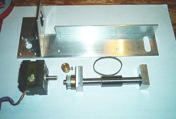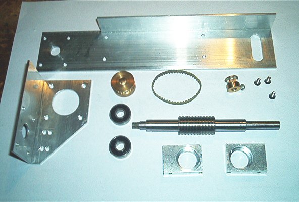Kompletny montaż zawiera także sinik krokowy połączony ze śrubą napędową przekładnią paskową w stosunku 2:1 składającą się z elementów systemu T2.5: koła zębatego 12 zębów na osi silnika, koła zębatego 24 zęby na osi śruby oraz paska zębatego o długości 120 mm (48 zębów). Wkręty użyte do skręcenia wsporników śruby oraz łożysk to M3 z łbem stożkowym. Otwory na te wkręty wykonane w podstawie zespołu napędowego są fazowane pod łby śrub aby podstawa mogła płasko leżeć na powierzchniach montowania i mogła się bez oprów obracać wokół otworu wykoanego od strony silnika. Odległości w jakich leżą oś silnika i oś śruby napędowej są tak dobrane, że powodują wstępne napięcie paska a dokładną regulację napięcia można uzyskać przez zmianę położenia silnika na wsporniku. |
