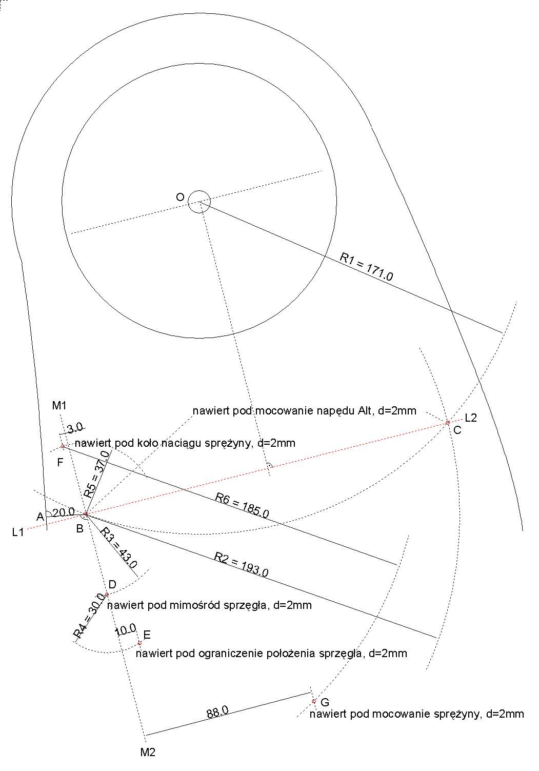 Montaż mechanizmu napędowego na wsporniku tubusa jest zadaniem nieco trudniejszym ze względu na krzywiznę wspornika. Pokazany rysunek odnosi się do wewnętrznej powierzchni lewego wspornika (patrząc od tyłu teleskopu). Pracę należy zacząć od wyznaczenia z punktu O (oś obrotu tubusa czyli osi wysokości) łuku o promieniu 171mm. Następnie należy wyznaczyć na tym łuku punkt B oddalony od brzegu wspornika (od punktu A) o 20mm. Odległość A - B należy mierzyć możliwie prostopadle do brzegu wspornika. Mając punkt B można wyznaczyć punkt C kreśląc łuk z punktu B o promieniu 193mm. W punktach B i C mocowany będzie do wspornika montażu wspornik napędu osi wysokości. Punkty B i C wyznaczają prostą L1-L2 służącą do dalszego wymiarowania. W punkcie B należy następnie wystawić linię prostopadłą do linii L1-L2 tworząc linię M1-M2, na której następnie trzeba wyznaczyć punkt D czyli miejsce mocowania mimośrodu sprzęgła. Punkt E wyznaczany jest względem punktu A a punkt F względem punktu B a oba te punkty mają swoją drugą współrzędną liczoną względem linii M1-M2. Ostatnim punktem do wyznaczenia jest punkt G czyli miejsce mocowania sprężyny sprzęgła napędu. Krytyczne dla prawidłowego działania napędu są punkty B i C, które muszą z jednej strony leżeć na łuku oddalonym od środka O o 171mm a zdrugiej strony powinny być oddalone od siebie o 193mm. Drugim krytycznym wymiarem jest odcinek A-B. Zachowanie wymiarów tego odcinka pozwoli na 'schowanie' mechanizmu napędowego w całości wewnątrz teleskopu.