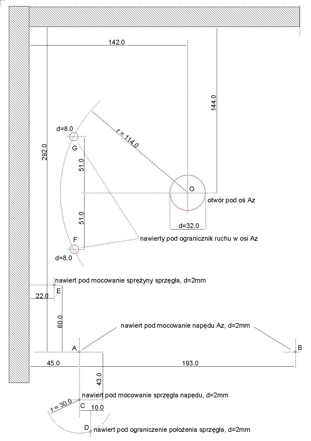 Montaż mechanizmu napędowego osi azymutalnej należy rozpocząć od sprawdzenia czy oś azymutalna (jej środek czyli punkt O) znajduje się w podanych na rysunku odległościach od ścianek wsporników pionowych tubusa. Jeśli nie to należy oczywiście uwzględnić to przesuwając odpowiednio poszczególne punkty. Kolejno należy wyznaczyć punkty A oraz B gdzie mocowany jest wspornik mechanizmu napędowego. Względem punktu A należy wyznaczyć położenie punktów C i D związanych ze sprzęgłem napędu oraz punkt D, w którym mocowana jest sprężyna mechanizmu sprzęgła. Punkty należy wyznaczać wykorzystując ekierkę przykładaną do wsporników tubusa, dla pewności można robić to z obu stron wspornika. Wszystkie punkty należy nawiercić wiertłem 1.5-2mm na głębokośc ok. 5mm pod wkręty mocujące. Na końcu należy wyznaczyć położenie punktów F i G, które należy nawiercić wiertłem d=8mm na głębokość 12-14mm. W otwory te należy następnie wkleić odcinki śruby M8 o długości ok. 20mm. Po wklejeniu śruby te stanowią ograniczniki ruchu montażu względem osi Az co zapobiega przypadkowemu uszkodzeniu śruby napędowej przez koło napędowe. W ten sposób ruch teleskopu wokół osi azymutalnej zostaje ograniczony do ok. 300 stopni. Ze względu na rozmiary rysunków zamieszczam linki do plików (jpg i doc). Rysunki powinny zmieścić się na arkuszu A3 więc możliwe jest wydrukowanie ich bezpośrednio w takim rozmiarze i użycie jako szablonu wprost na elementach teleskopu.